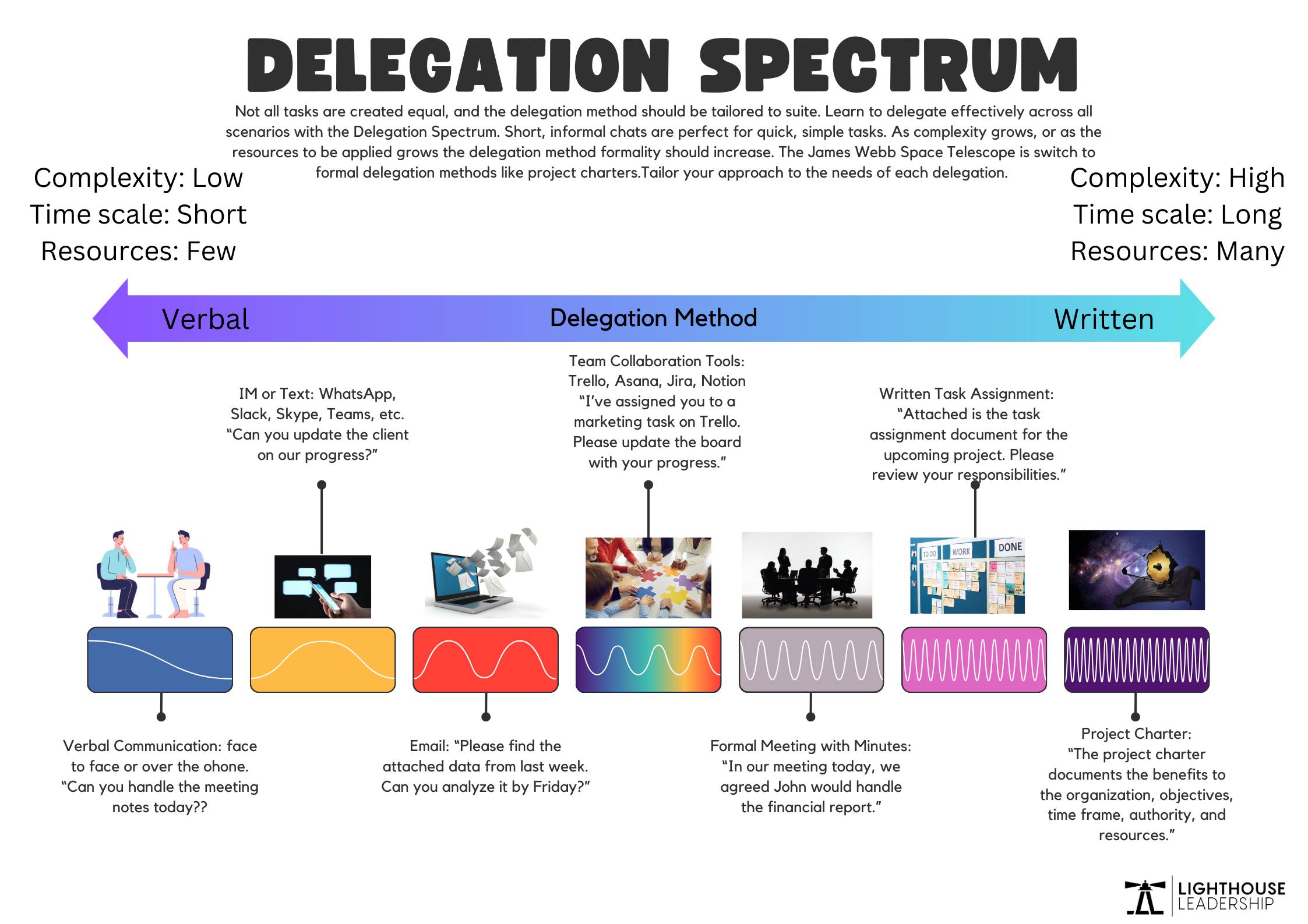 I’ve not seen anybody else write about this. I’m starting to built this concept of a Delegation Spectrum. As the task being delegated gets more complex, the form of the delegation itself gets more formal.