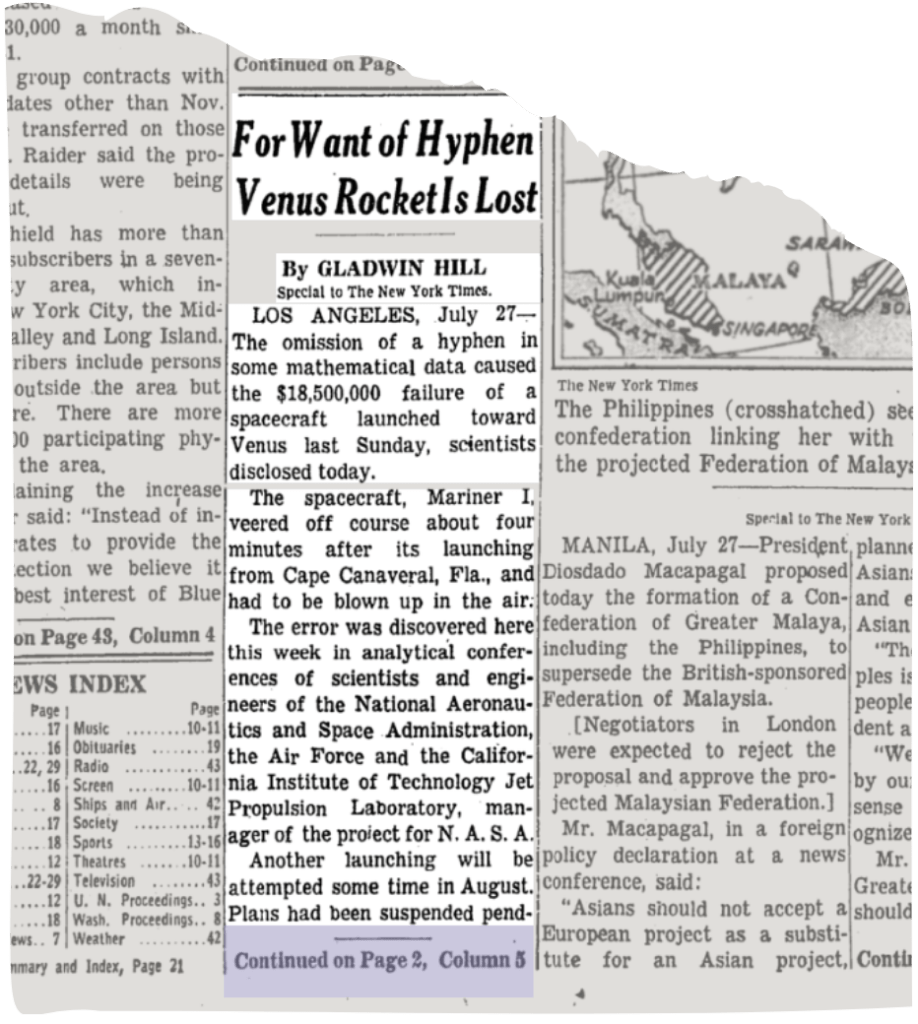 The cause of the guidance system failure? A missing hyphen in some software code. Software John Norton had supervised.